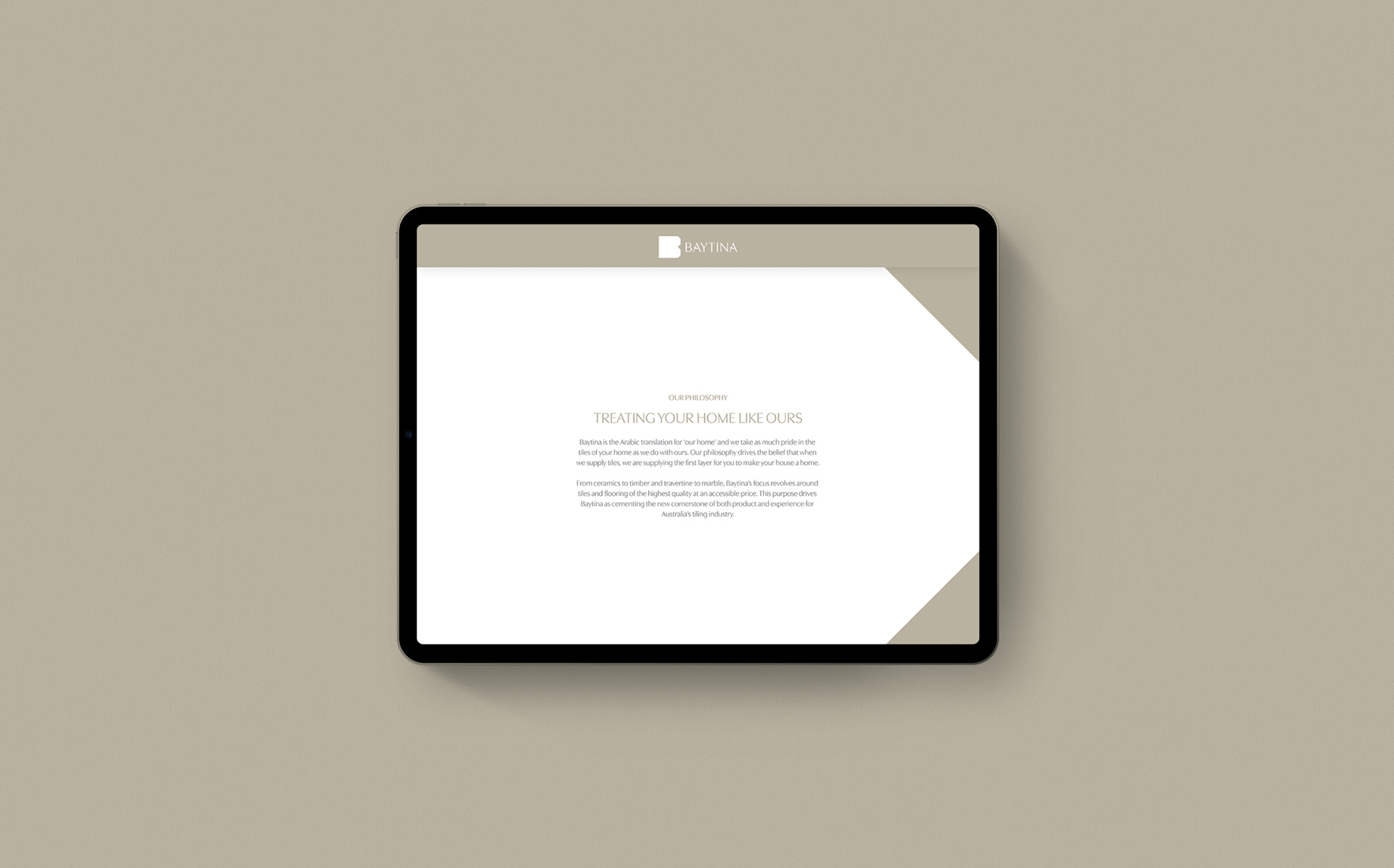 With a minimal B shape reflective of a bespoke cut tile, the tile itself is made the focus of the Baytina brand through all its graphic representations. From strategy, copywriting, identity, branding and digital, the Baytina look and feel was designed to reflect a considered, refined and aesthetically driven brand.